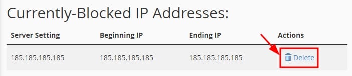 To re-enable the access, simply head to the Currently-Blocked IP Addresses list in the same section and click on Delete: