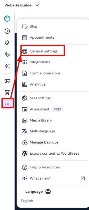 To find the general site settings in Hostinger Website Builder, click on the ellipsis ⋯ button on the left, and select General settings: