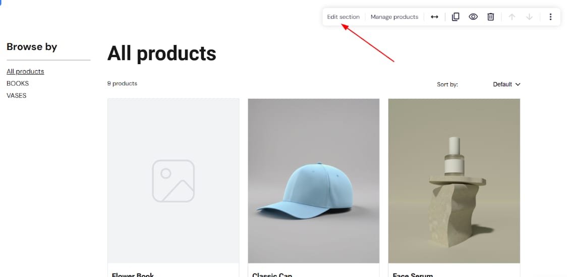 By default, the product list section displays all products, but you can easily change that in the section settings. Click on Edit section: