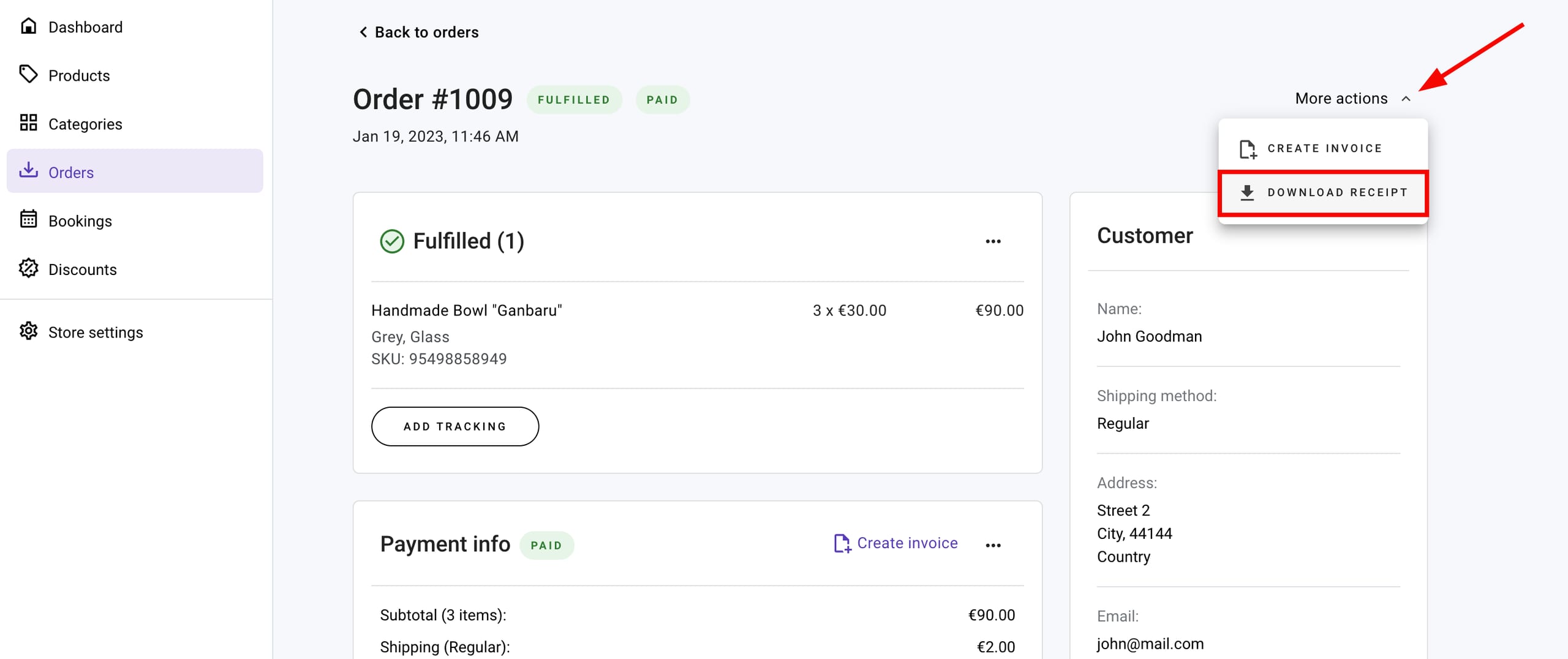 In your store management area, go to the Orders page and open the order in question. Find the dropdown More actions in the top-right and click Download receipt: