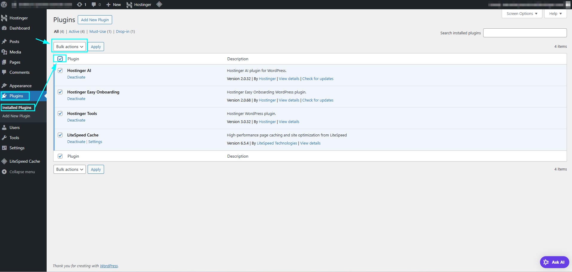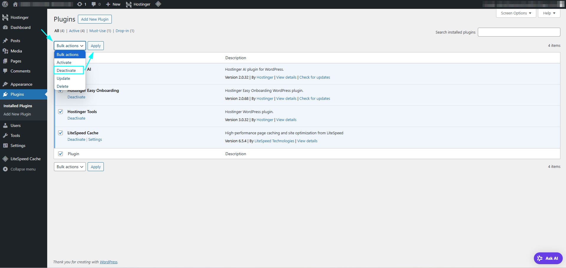 Select all the plugins, click on “Bulk Actions”, select “Deactivate,” and click on Apply:
