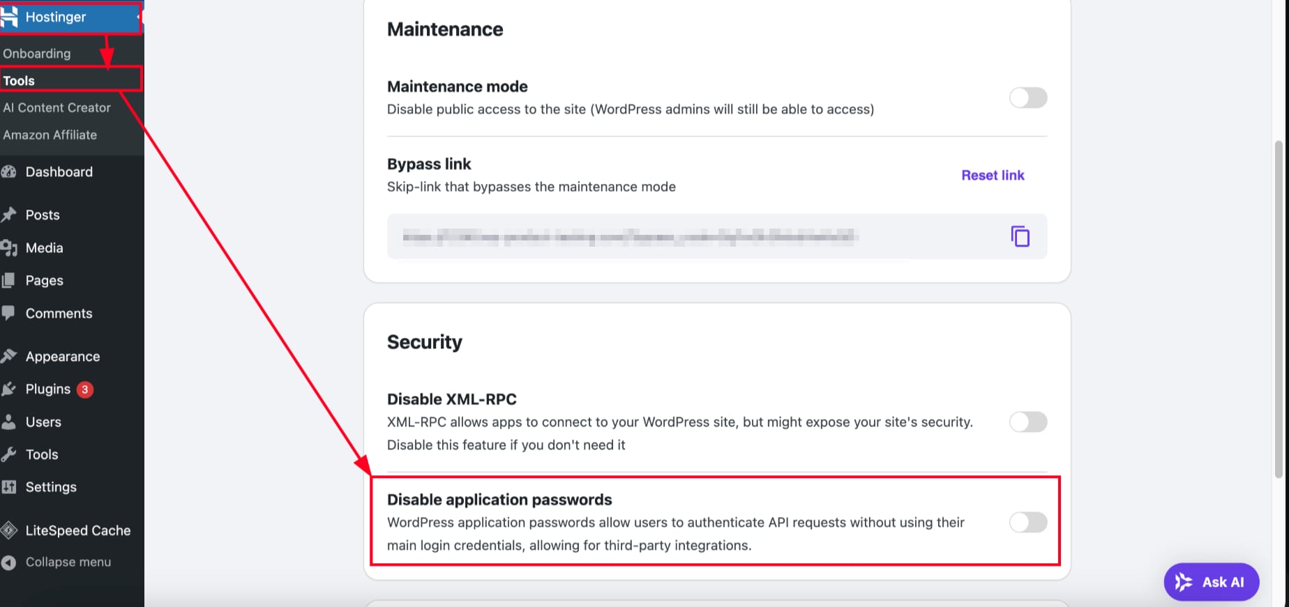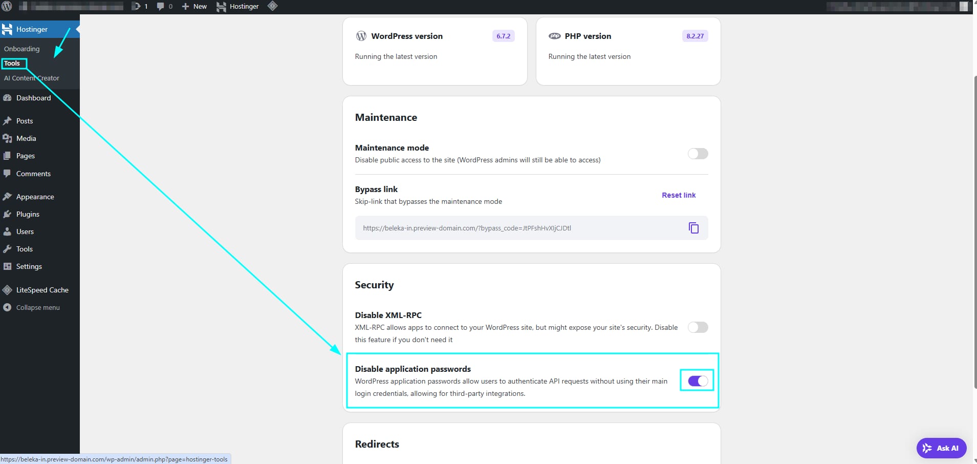 You can enable this by going to your WordPress website’s admin dashboard, clicking on Hostinger Tools plugin and following as per the image below: