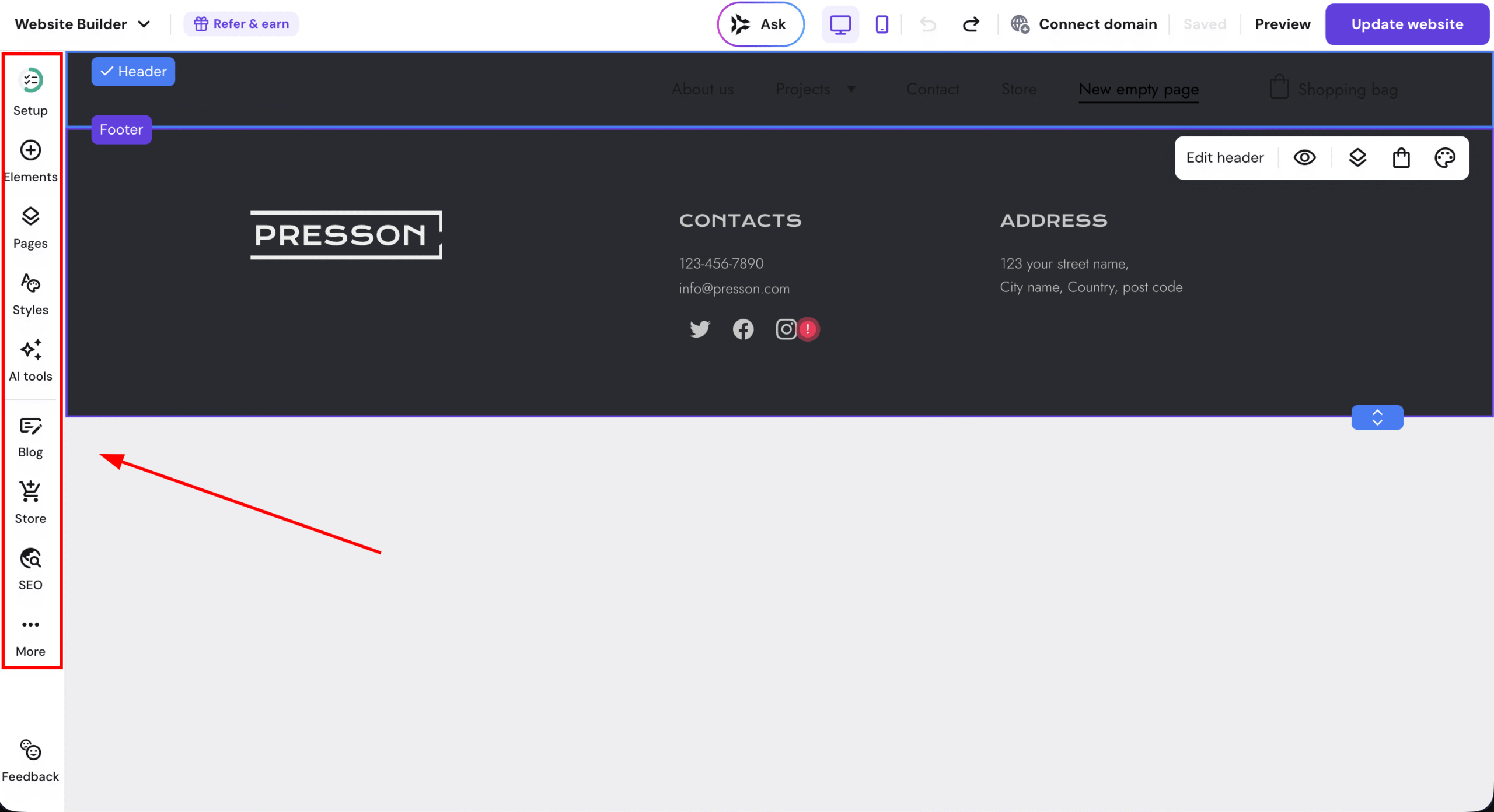 In the Pages panel on the left, you can find and manage all your website pages: The navigation menu is always visible in the header section |