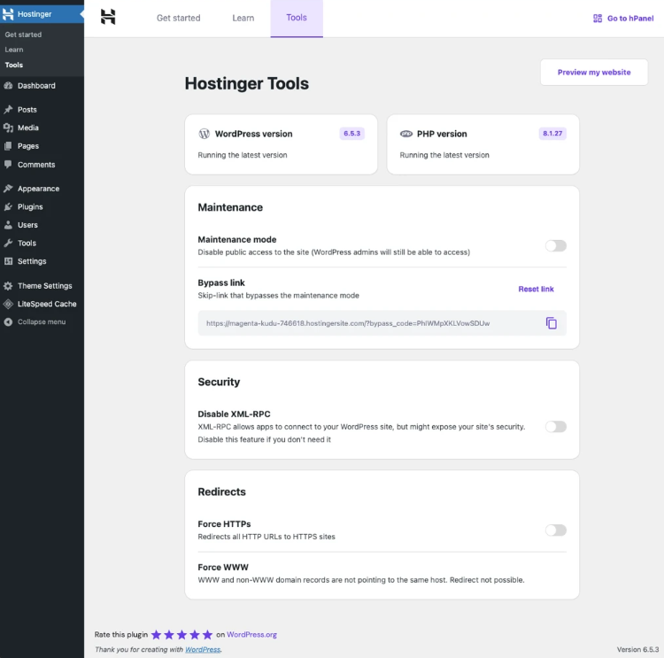 Hostinger Tools is an all-in-one plugin designed to help you manage essential settings for your WordPress site directly from the WordPress admin panel.