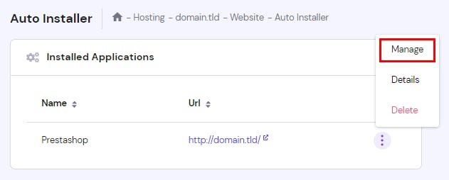 To access your PrestaShop Administration Page, on the Auto Installer page, click on the options button () next to the application and select Manage: