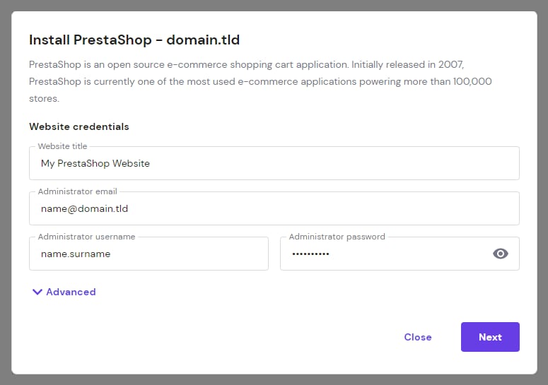 Setting up a PrestaShop website using Auto Installer at Hostinger