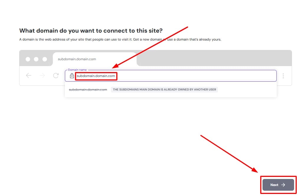 You will be redirected to a new page. There, simply write the subdomain you desire, as in the example below, and click on the message it will appear on the banner under it, then click on “Next” button: