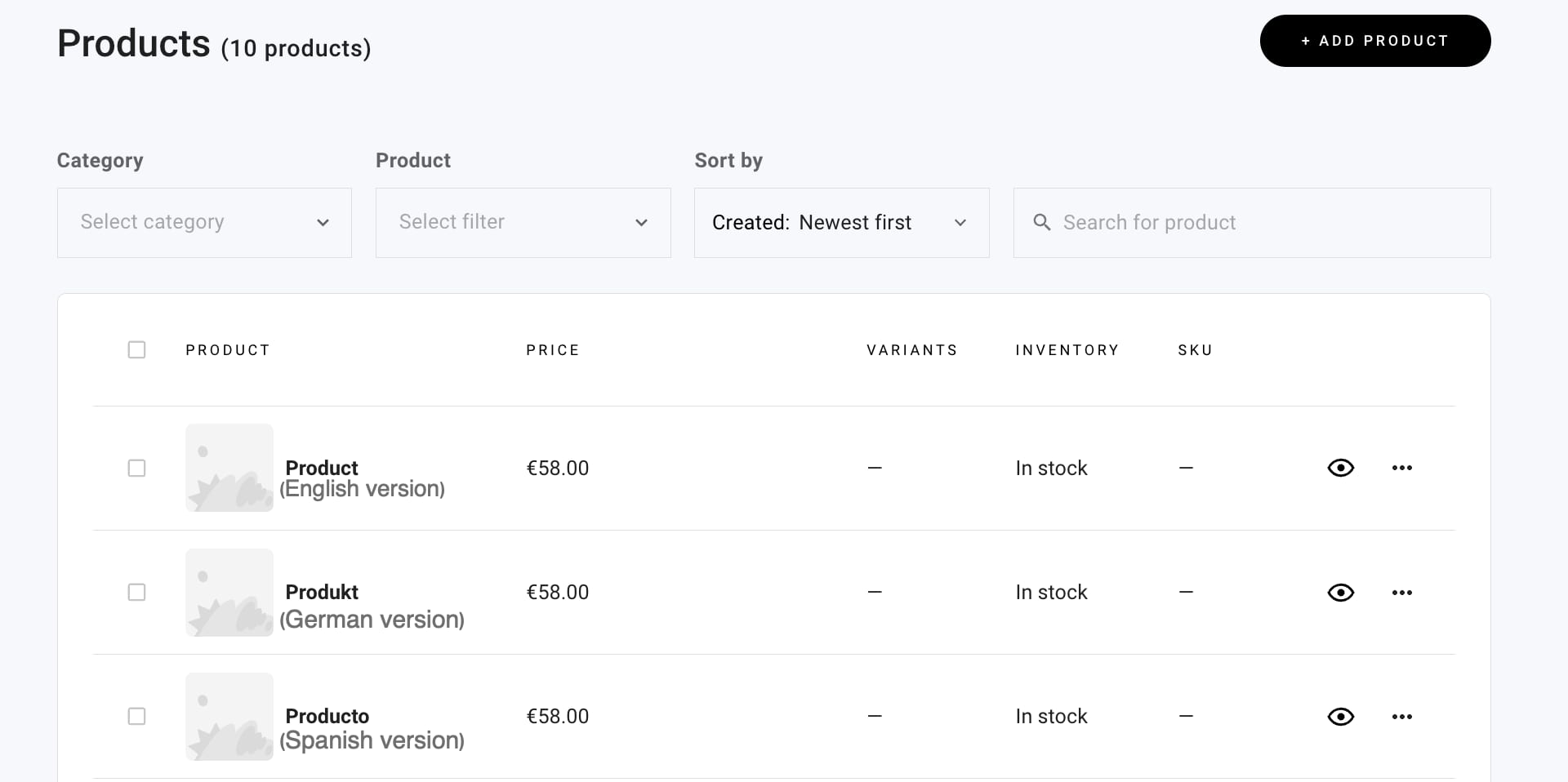 In the store management area, create products in as many languages as you need. For example, create: