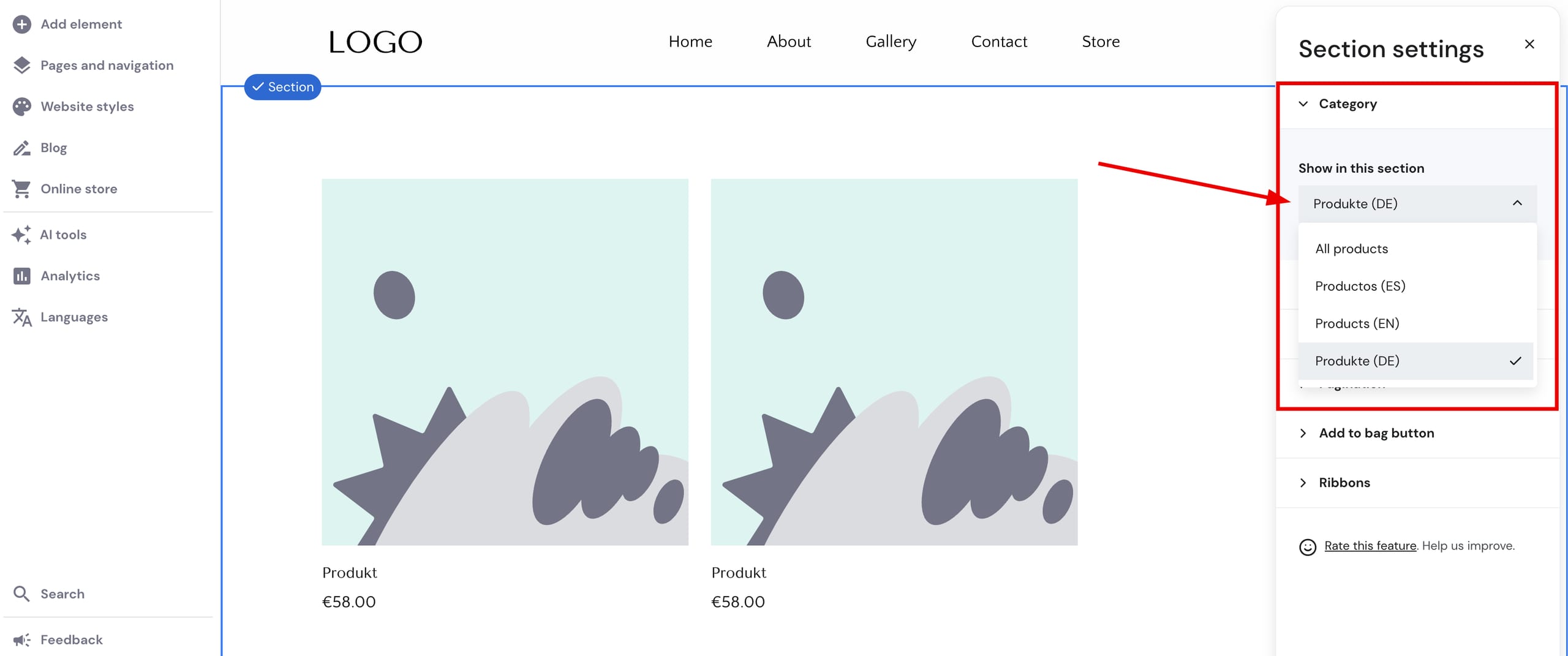 In the website’s editor, find the preferred pages on which you want to display products; you may also create new pages for that. Insert a product list section per each page and specify a particular product category to display.