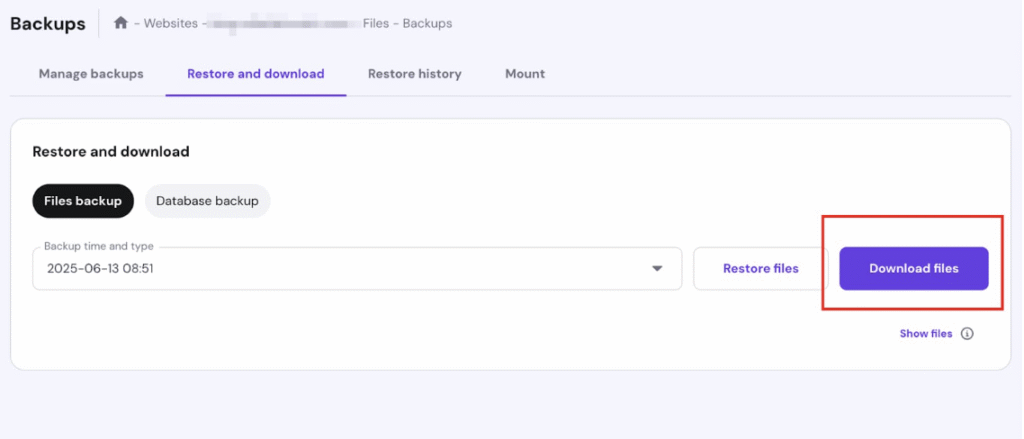 - The complete list of all the available backups by date will be shown on the drop-down menu. The time indicates when the backup was created, in your local timezone. Choose the backup preferred date from these options and click Download files: