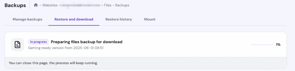 - After clicking on Download files, you will be notified that backup preparation has started. The time will vary depending on the size of your backup. You can monitor the progress in the Restore and Download tab.