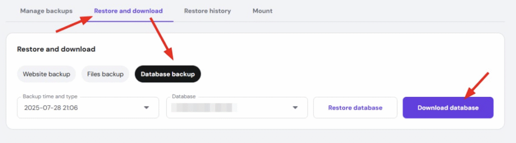 A similar process applies when downloading generated databases – select Database backups. Select your website’s database and the backup date, then click on Download database: