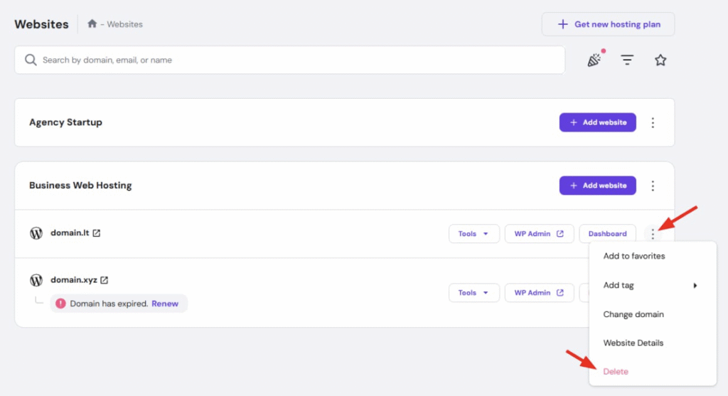 - In hPanel, go to Websites, find the website in question, click on the ellipsis ⋯ button, and select Delete: