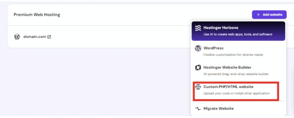 - In hPanel, go to Websites, find the preferred hosting plan, click on Add website, and select Custom PHP/HTML website as the preferred platform