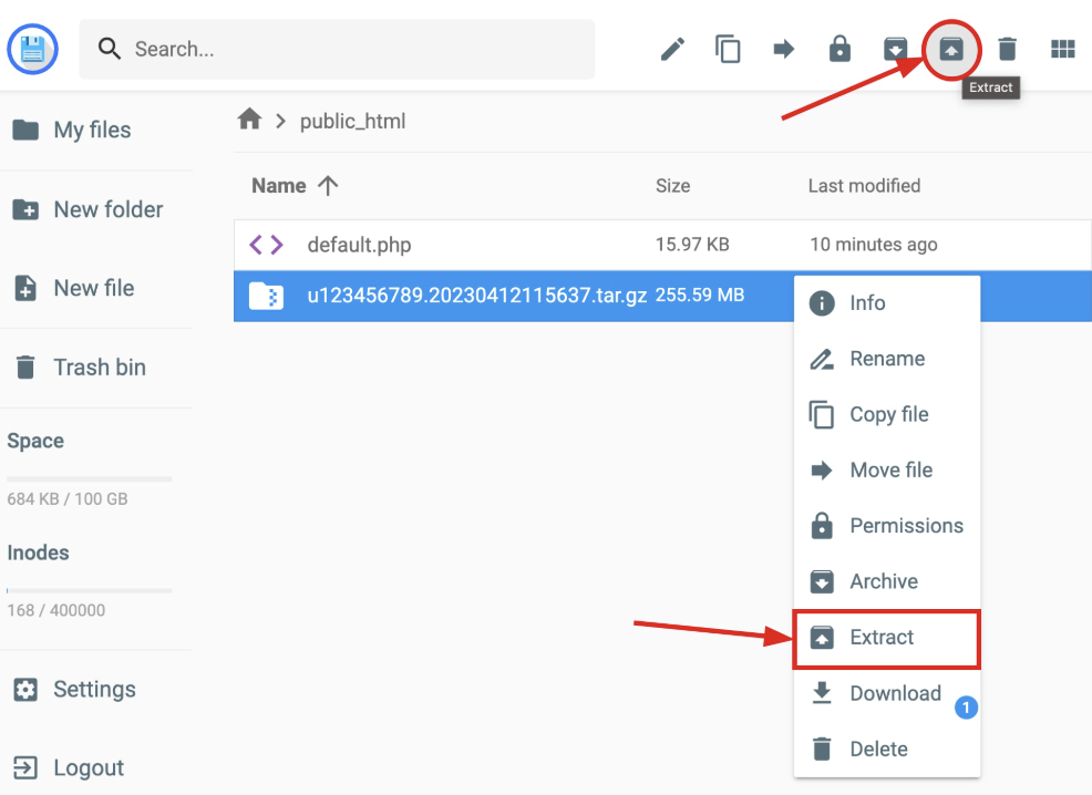 - Once the upload is complete, right-click on the file name and choose Extract, or click on Extract in the top-right: