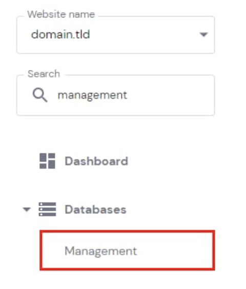 - Before uploading the database, you will need to create a new database where to import your database backup. Go to Websites → Dashboard → Databases → Management on the sidebar: