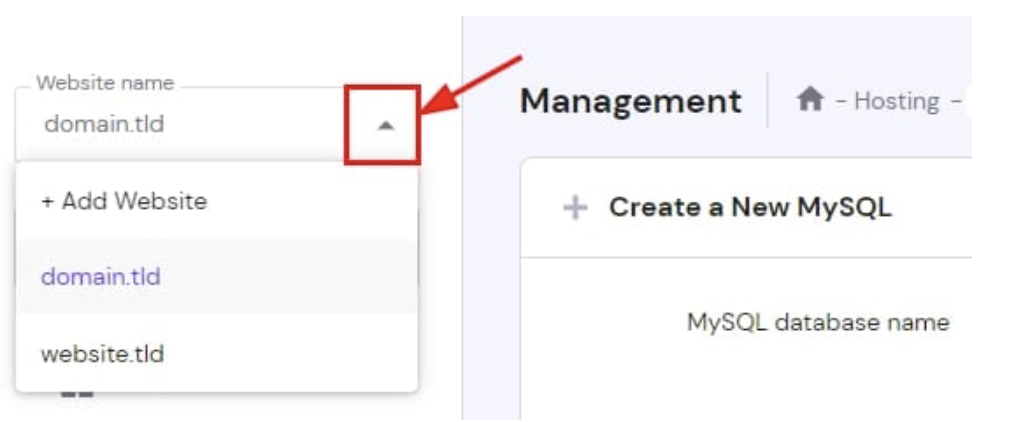 - Make sure the correct website (the one you want to upload the database to) is selected in the left drop-down menu: