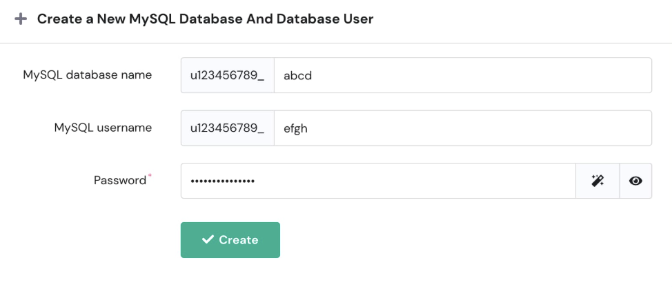 - In the section Create a New MySQL Database And Database User, enter the name, username, and password of your database.
