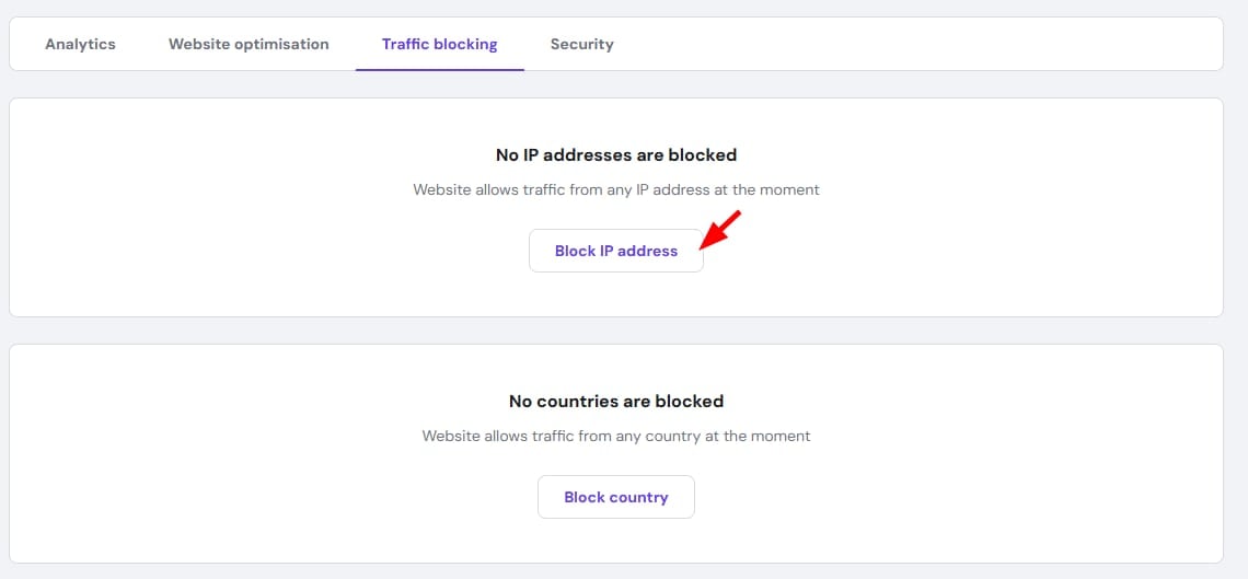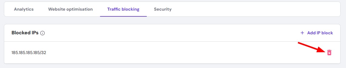 Now, open the section Traffic blocking, click on Block IP address, or Add IP block, select the IPs, or IP ranges you want to block, and click on Block to confirm: