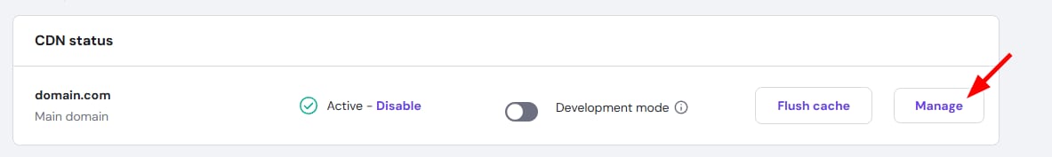 In hPanel → Websites, click on Manage next to the website in question. Then, on the sidebar, search for CDN and open its settings: