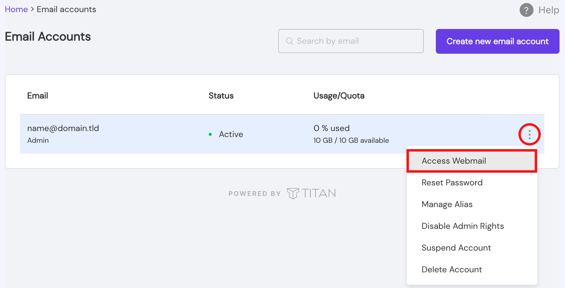 Go to Email Accounts, click on the ellipsis ⋮ button, select Access Webmail, and log into your email account: