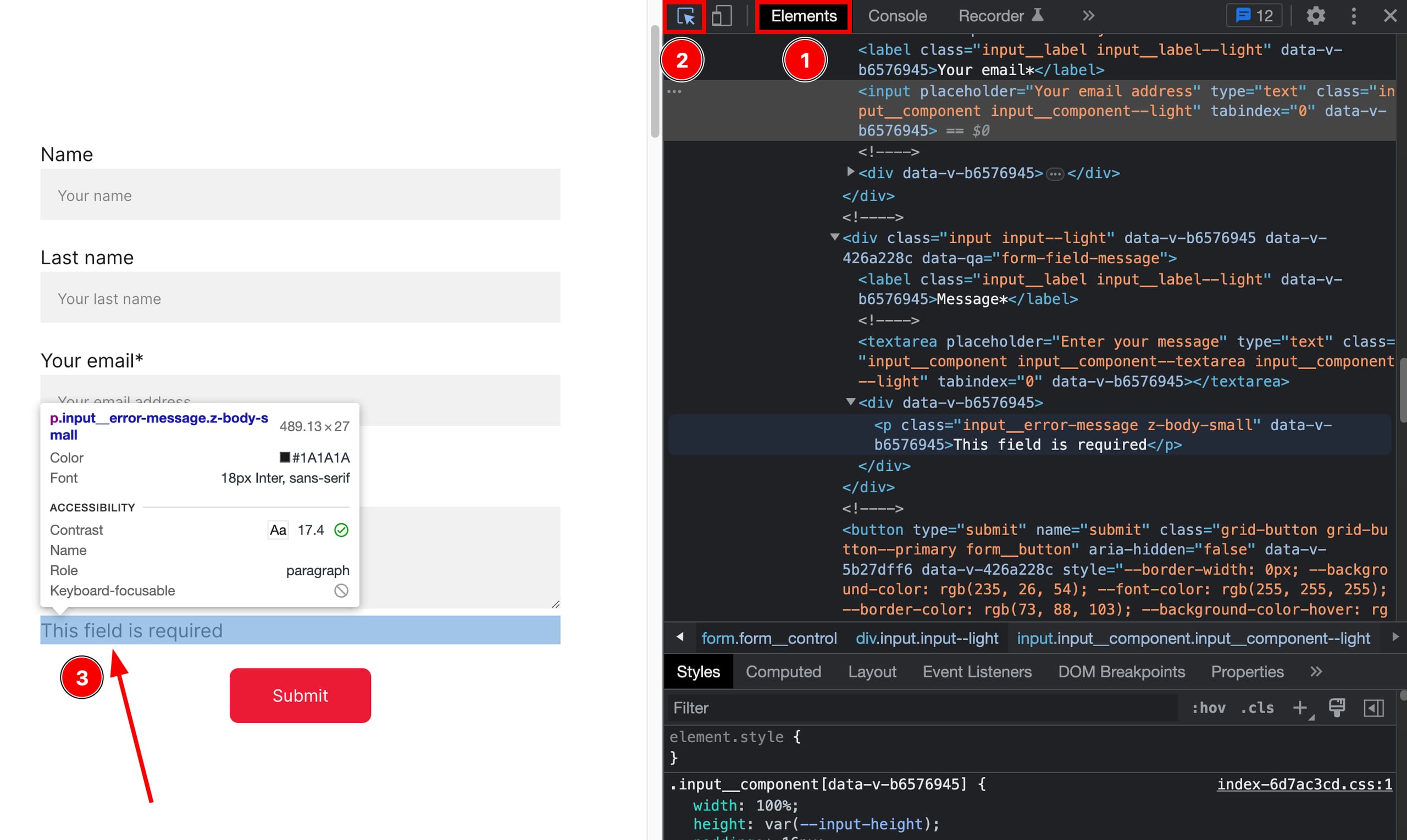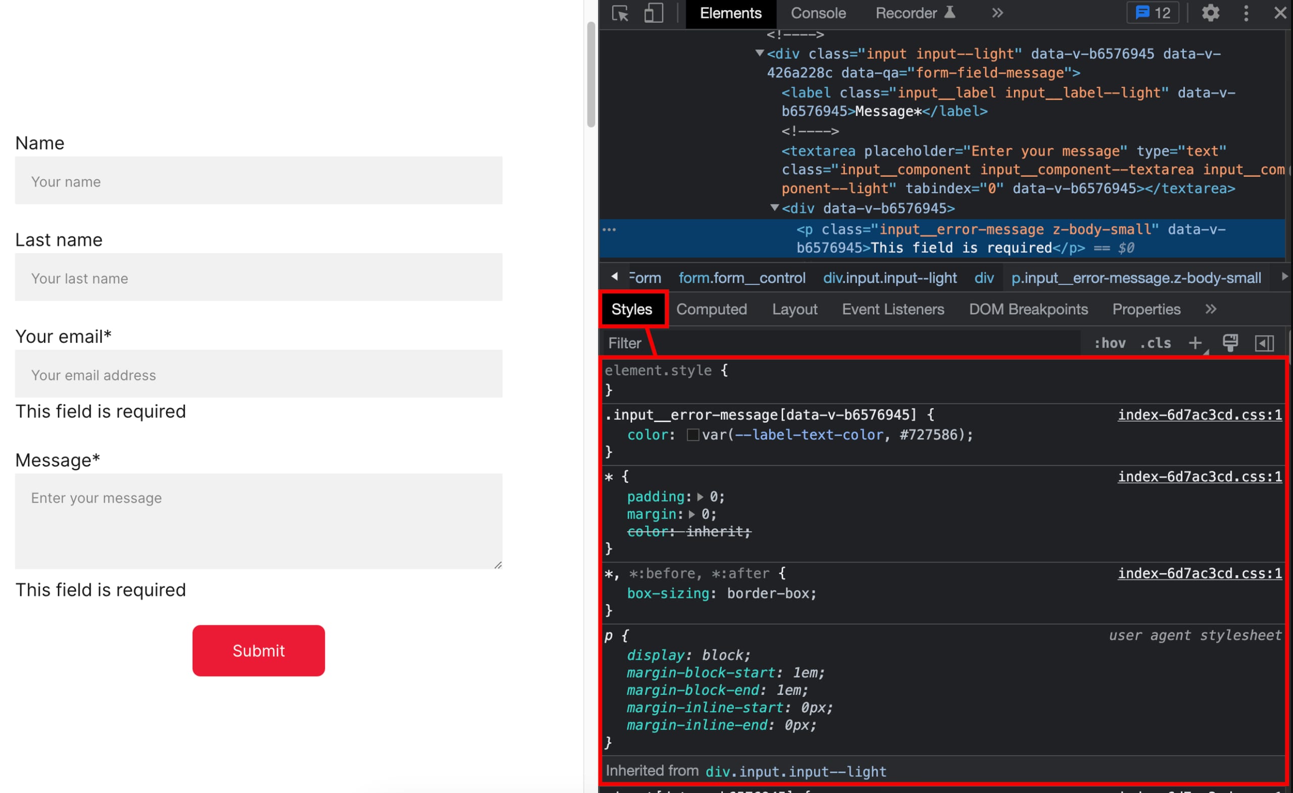 In this example, we’ll change the font color of the phrase This field is required that’s visible if somebody tries submitting a contact form without filling in the required fields: