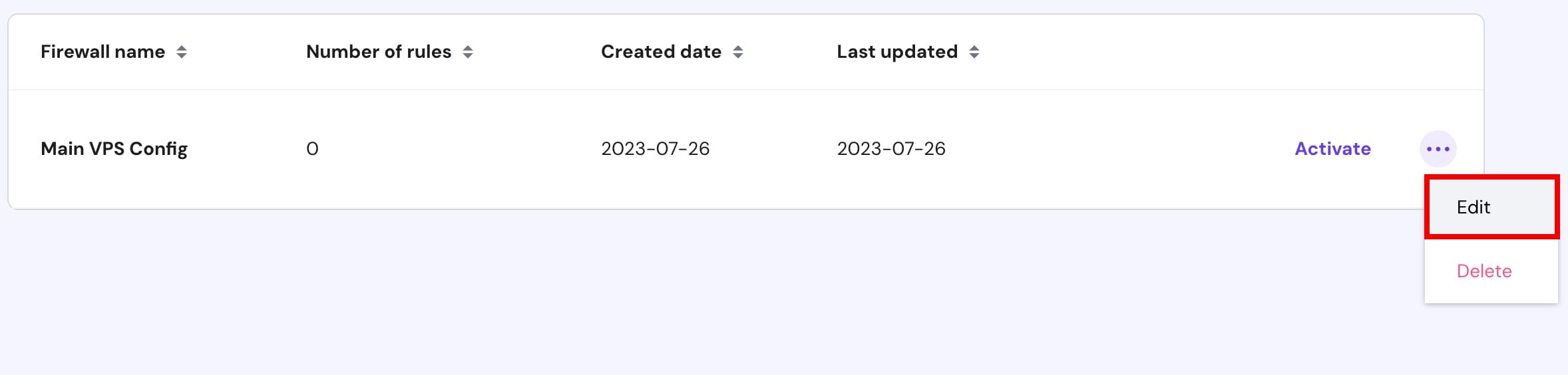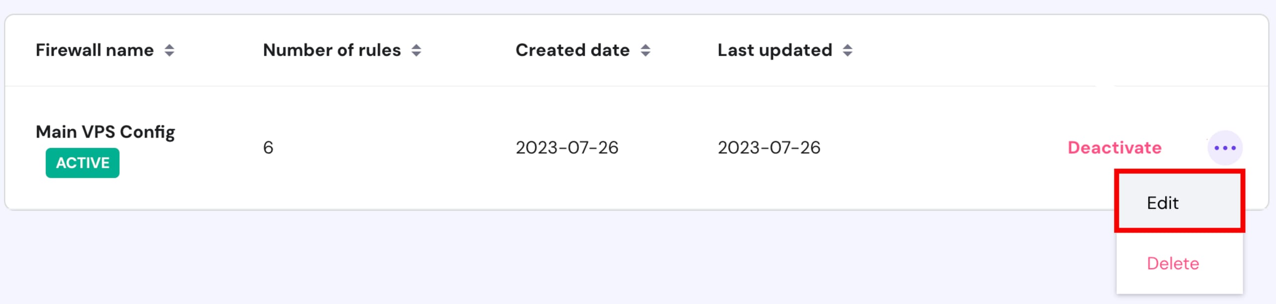 Open the VPS section on your hPanel and click on the server in question. Then, click on Firewall in the left sidebar, click on the ellipsis button ⋯ next to the preferred firewall group list, and select Edit: