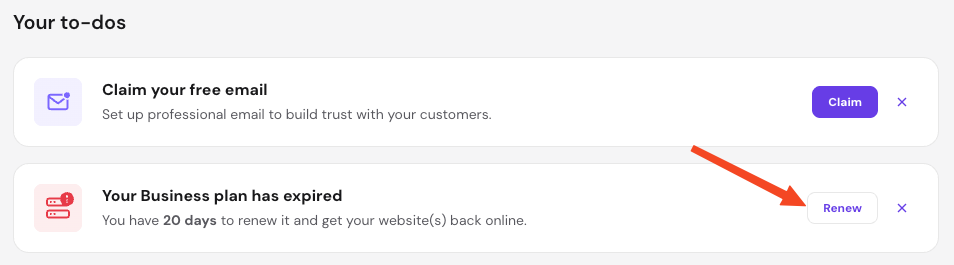 If your web, cloud, or Agency hosting plan has expired due to a missed payment and now shows an Expired status, you can reactivate it directly from the home page of hPanel within 30 days of the expiration date. This process restores your websites so your online projects can go back online.