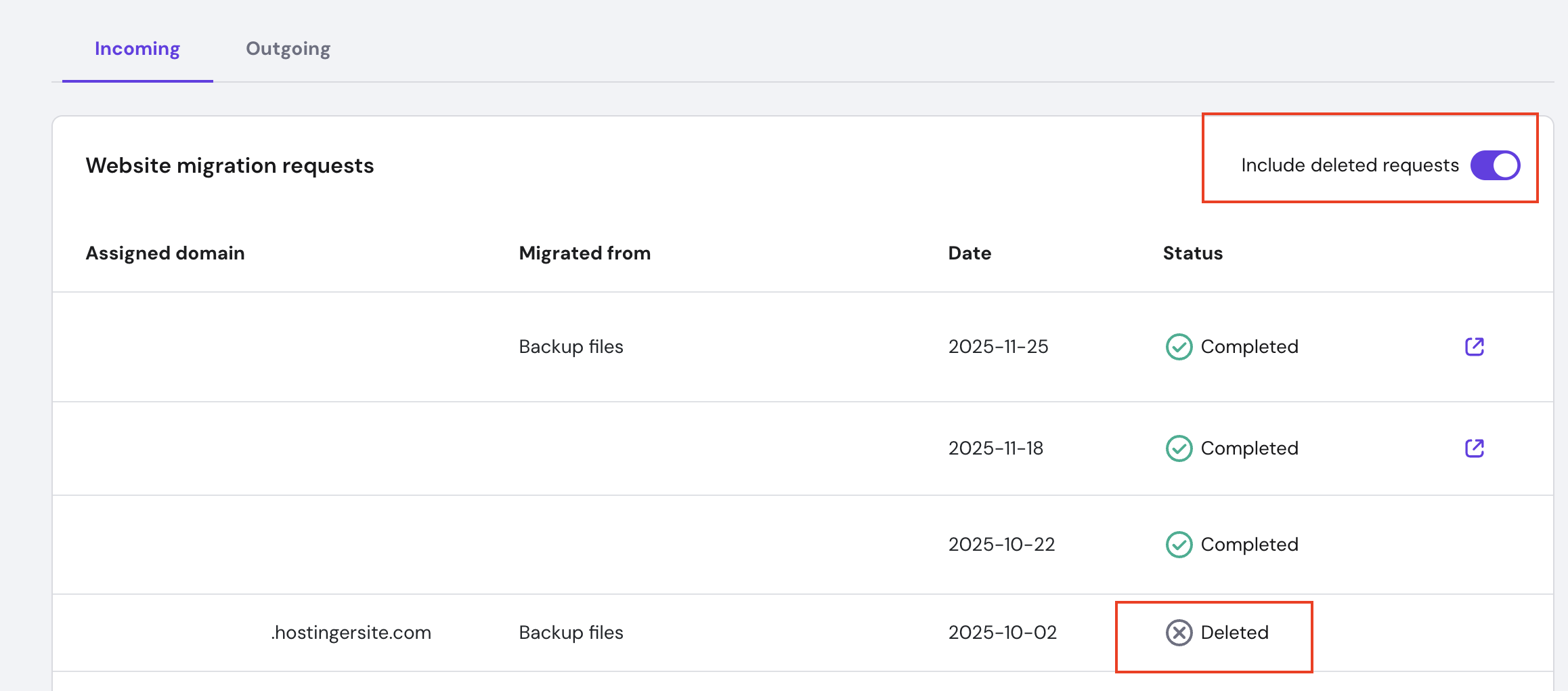 - Click Home → click the drop-down under the Websites section, click Migrations, and use the toggle filter to show deleted requests: