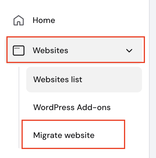 Click Home → click the drop-down under the Websites section and click Migrate Website: