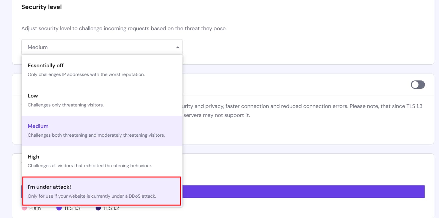 The “I’m under attack” mode is an advanced security level in Hostinger Content Delivery Network. It enables the browser challenge page for your website visitors, which helps fight DDoS attacks.