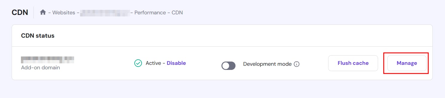 2. Check if the CDN is active – if not, enable it – and click on the Manage to access more settings: