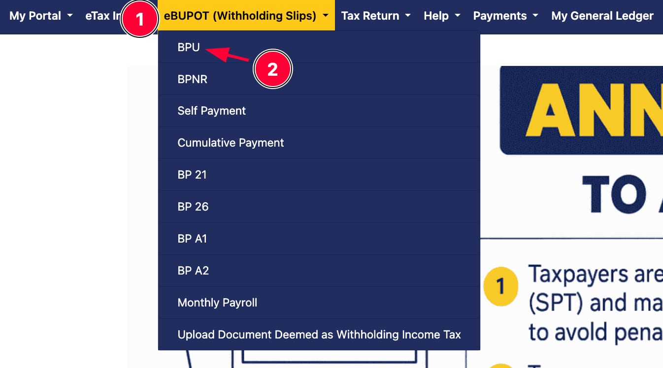 3. Navigate to eBUPOT (Withholding slips) (eBupot) menu and choose BPU (BPPU) on the top
