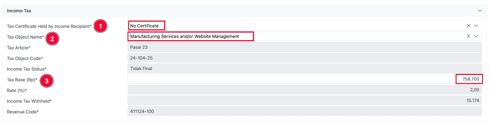 Tax base section fills the amount used Total excl. VAT on invoice. After this, Rate (%) (Tarif (%)), Income Tax Withheld (Pajak Penghasilan (Rp)), Revenue Code (KAP) will be filled automatically by system.