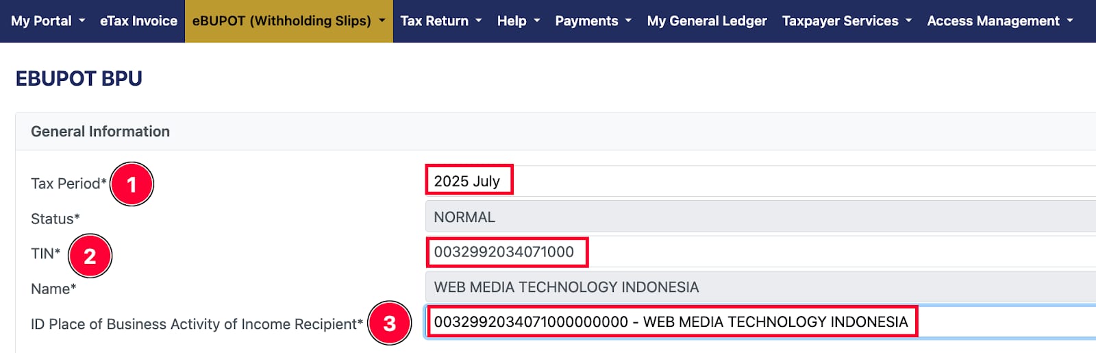 5. In the General Information (Informasi Umum) section, select the Tax Period (Masa Pajak) according to the invoice received. Enter the Tax Identification Number (NPWP) of PT Web Media Technology Indonesia (0032992034071000) and make sure that both the TIN (NPWP) and ID Place of Business Activity of Income Receipt (NITKU) are correct as shown in the following example.