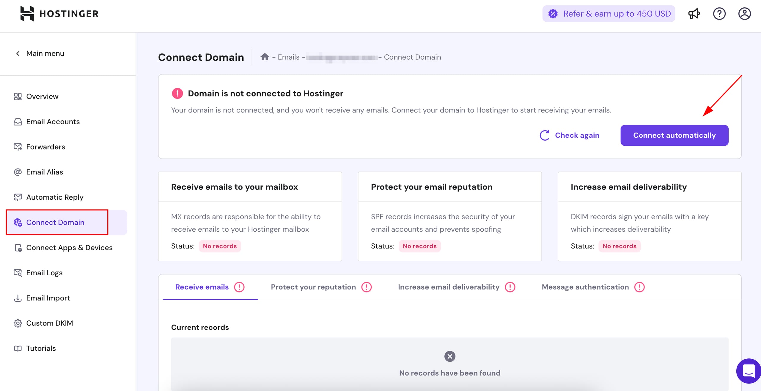 If your domain is connected to Hostinger via Hostinger nameservers, you can automatically set it up for Hostinger Email 👇