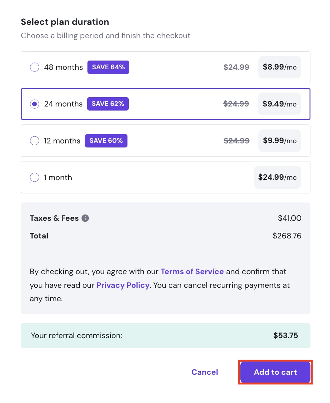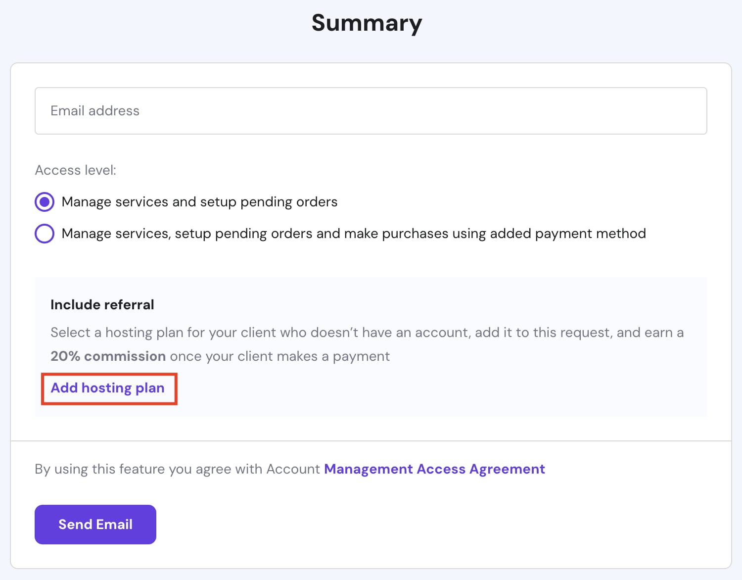 Enter the email address of the account you wish to request access to, and select the access level. Click on Add hosting plan: