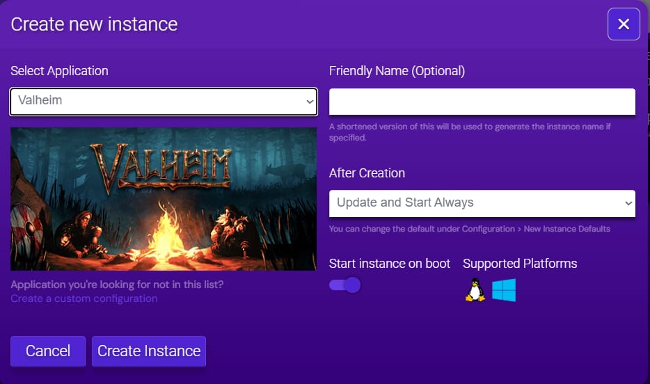 On your Game Panel, choose Create Instance, select Valheim from the dropdown list of applications and click on Create Instance.