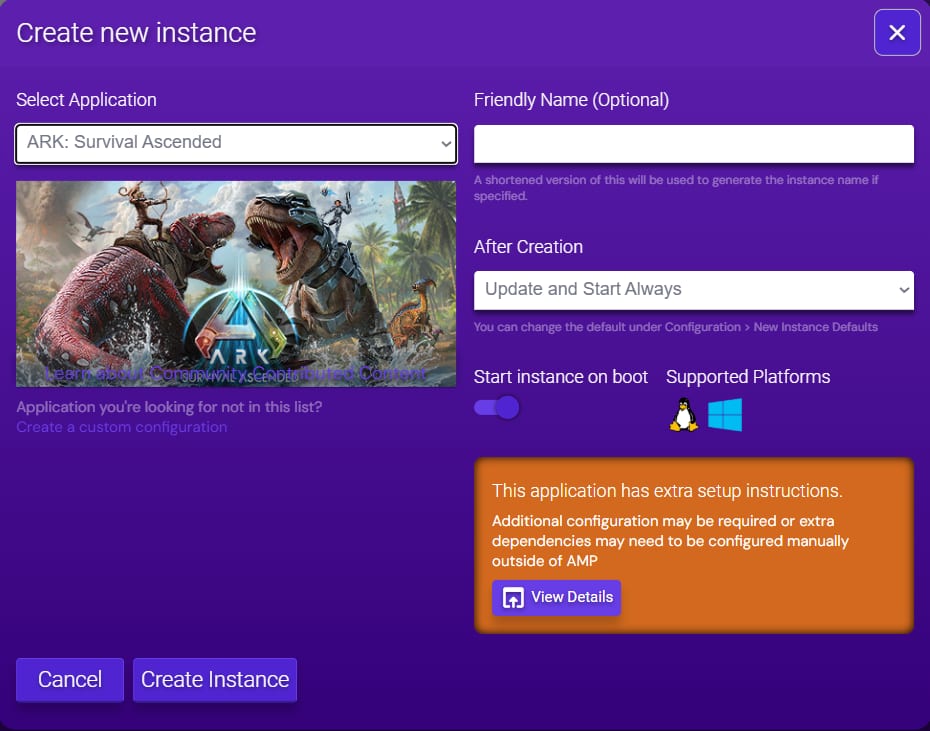 Once you log in, click on Create Instance. In the new window, select ARK: Survival Ascended as an application and press Create Instance: