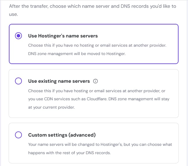 During the domain transfer to Hostinger, which can take up to 7 days, nameservers are locked and can’t be changed. That’s why you need to select one of the following options before starting the transfer: