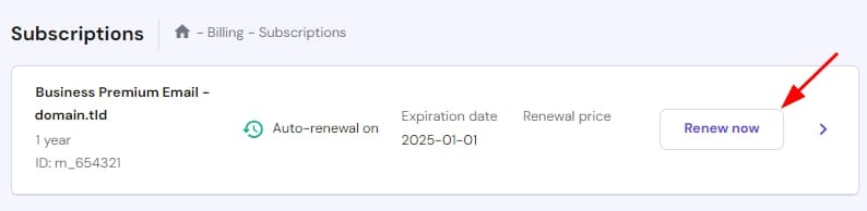 On the Subscriptions page, locate your Hostinger Email subscription. Next, click on Renew now: