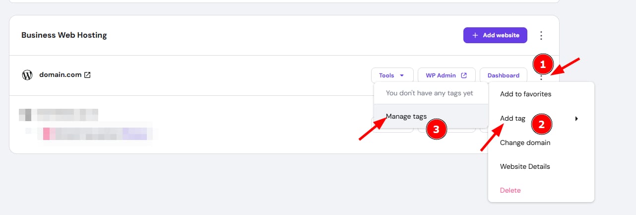 Navigate to the Websites section of hPanel and click on the three dots, then click Add tag: