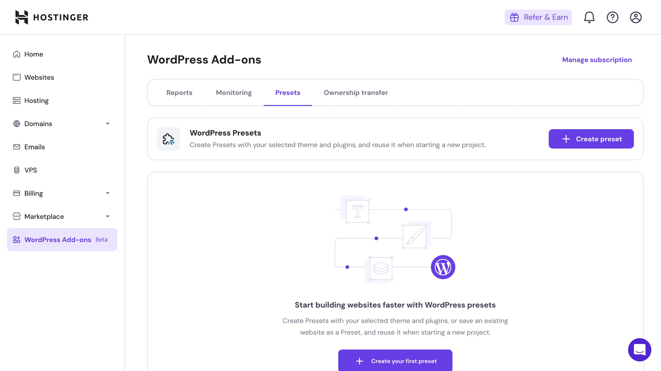 Step 1 – Login to hPanel. Once logged in to your Hostinger account, you will find quick access sections on the left sidebar. Click on WordPress Add-ons and navigate to the Presets tab.