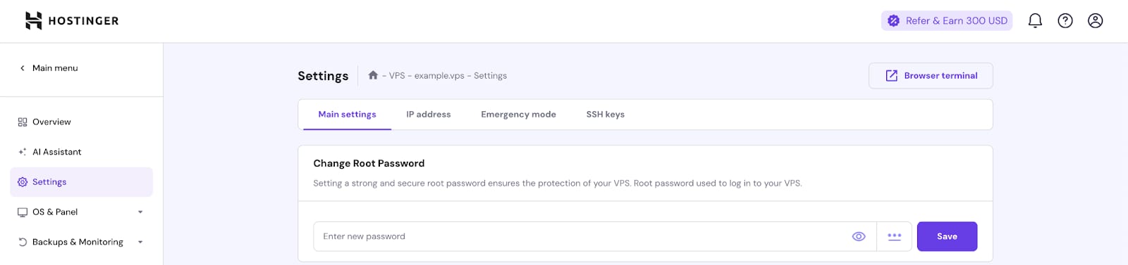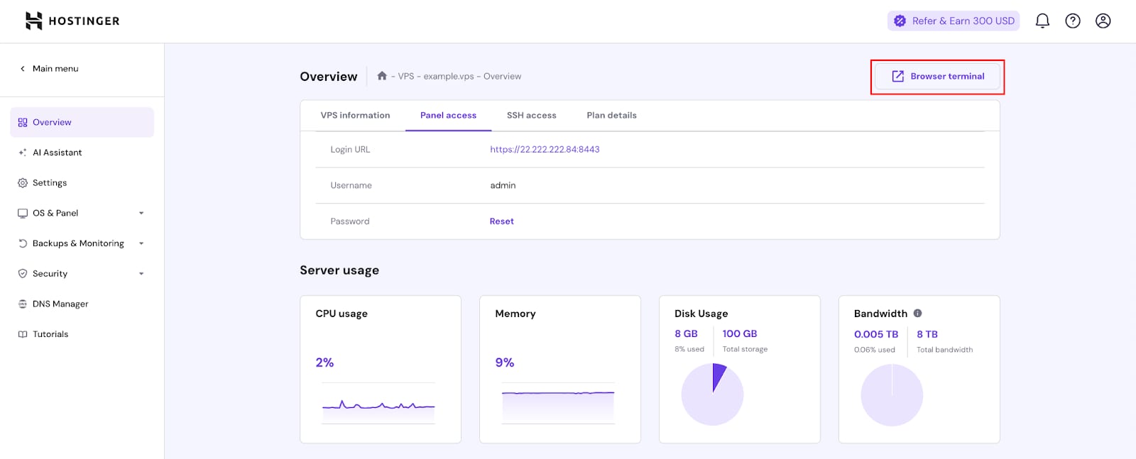 1. Log in to your VPS using Hostinger’s browser-based terminal.