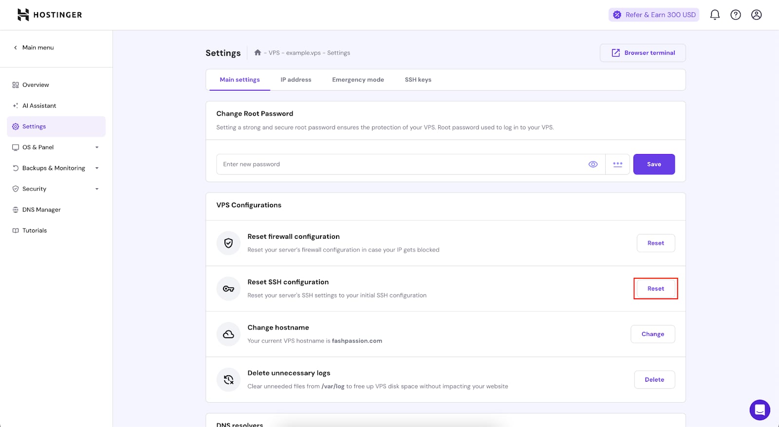 Hostinger provides an in-browser noVNC terminal that allows you to access your VPS directly from the hPanel without needing an external SSH client. This is a convenient option if you’re facing issues with your local SSH client or want quick access to your server.