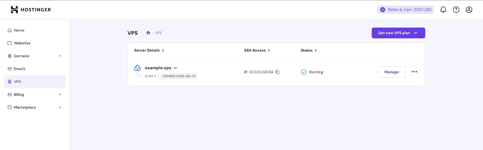 Access Hostinger’s VPS hPanel and confirm the VPS status is “Running”. Restart the VPS if necessary.