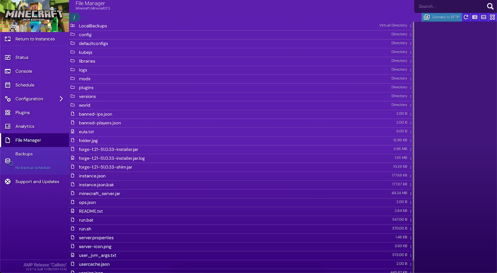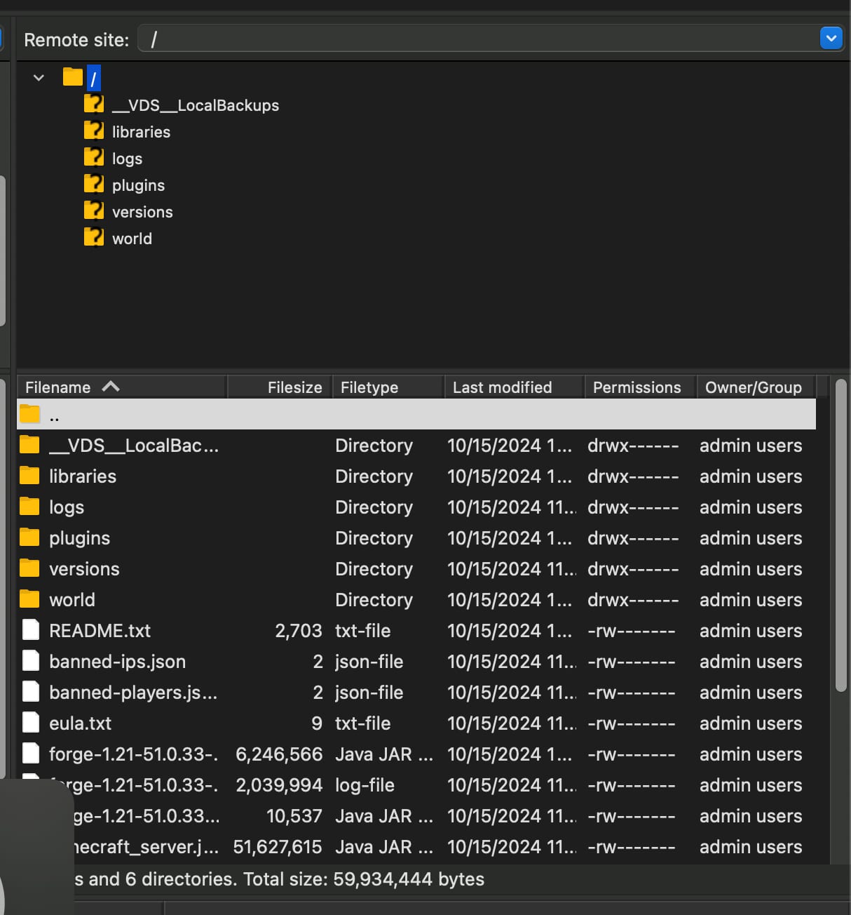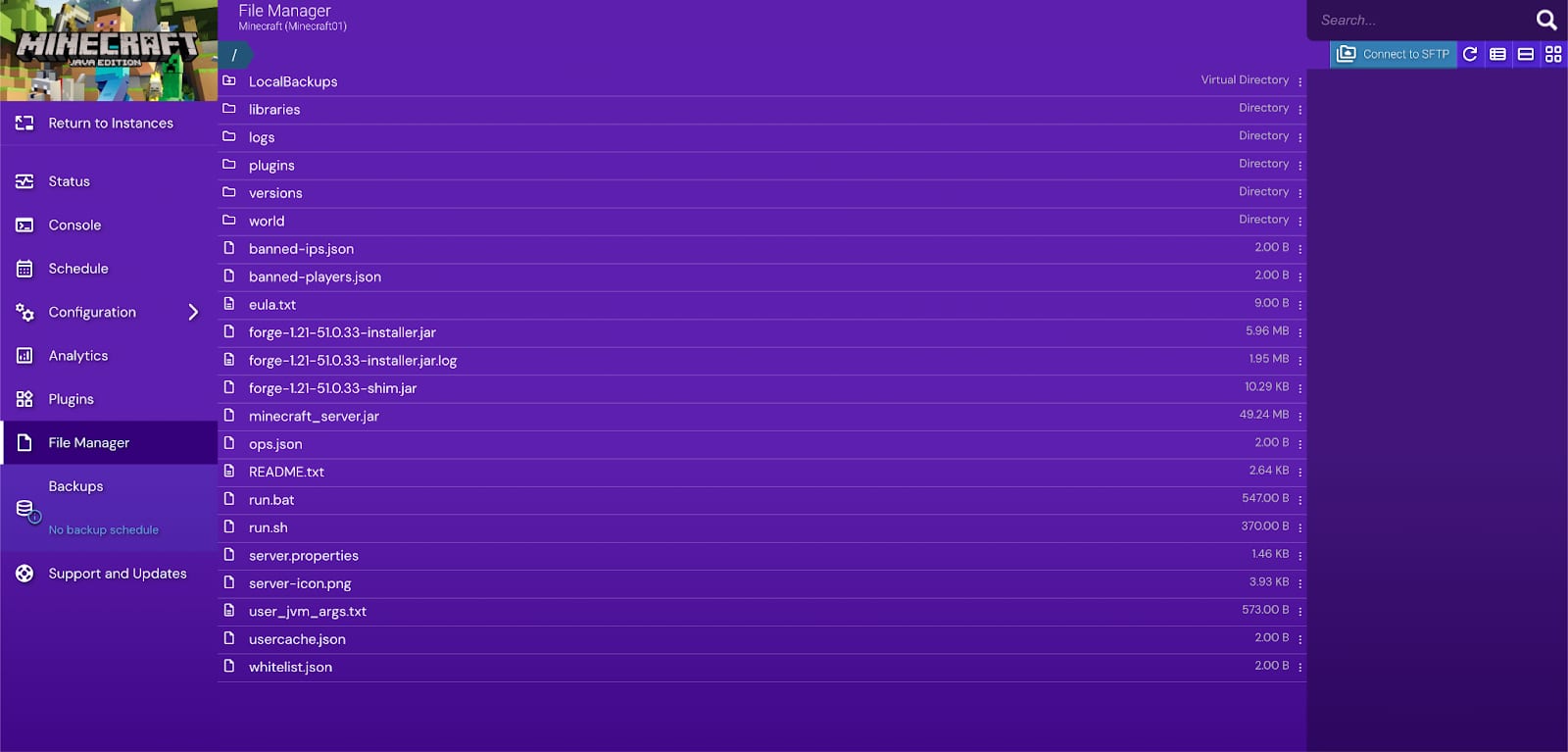 For this, use an FTP client like FileZilla or another similar program, and connect using the credentials provided by the panel. Once you’re logged in to your server’s file system, you should see the server files and directories.