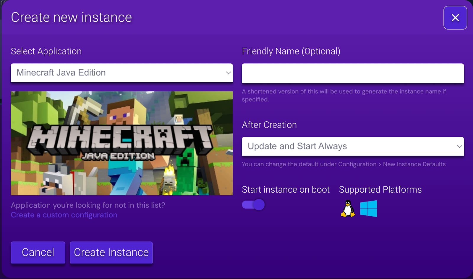 After accessing the control panel, the next step is to create a Minecraft instance.