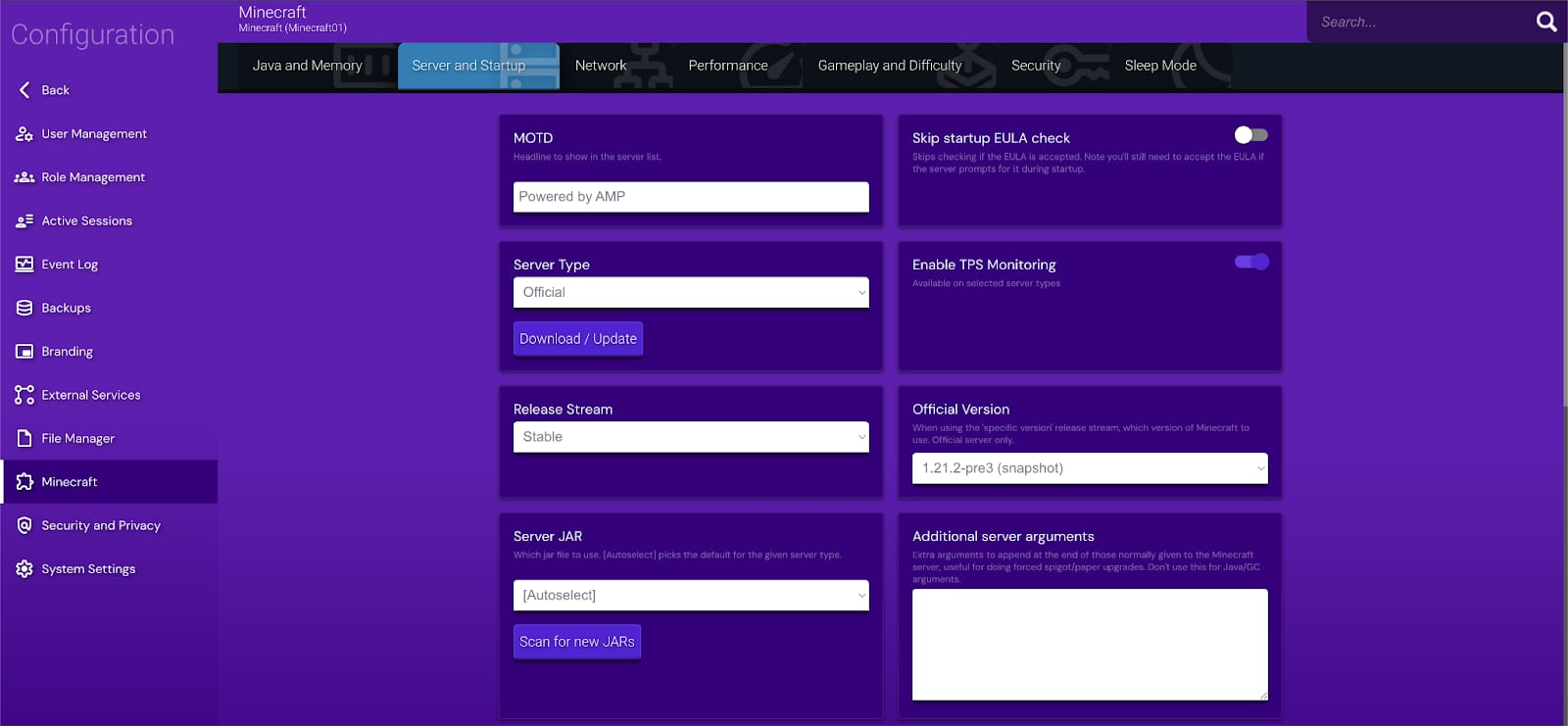 Within that, select “Minecraft” followed by “Server and Setup”. This will guide you through setting up the server environment for Minecraft.