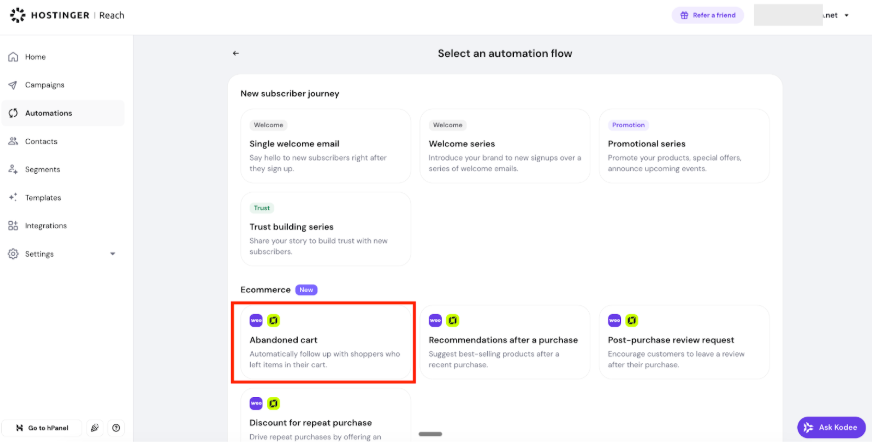 Abandoned cart emails help you recover lost sales by automatically sending follow-ups to customers who start the checkout process but don’t complete their purchase. With Hostinger Reach and Hostinger Website Builder, this process works through a built-in integration — no extra steps required.